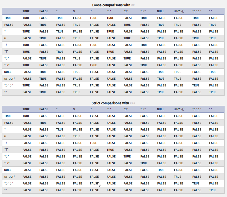The use of loose comparisons with user-controlled variables could allow an attacker to purposefully juggle the type of the variable being compared to result in an unintended result, subverting the intended application logic. The table below is fairly large, but if you look at the differences between the two, you’ll see a number of different outcomes from the same comparisons, depending on whether you are using loose or strict.