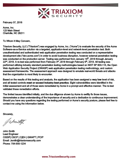 The third document you’ll get is a certification letter or certification memo. This document is an even higher-level review of the assessment that is meant to summarize the assessment in a one-page format that can be provided to compliance bodies or third-parties. By using this document, you can prove that your organization has had a penetration test or security assessment performed but not disclose any specific information or weaknesses associated with your environment. While you may be OK providing the full Executive Summary to some organizations or partners, this gives you another option to help protect you privacy and security.