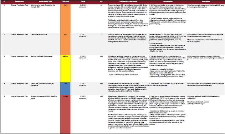 The first document you’ll receive is a full listing of all the vulnerabilities discovered in your environment, broken out line-by-line with the criticality of the issue, a detailed description of the issue (how to recreate the problem, what the risk is), our suggested remediation for the issue, and then any helpful reference links that either help describe the issues or provide more information on a fix. This document is extremely detailed and intended for the folks who need to fix these issues. This document is great for tracking remediation progress, however, as you can update and mark it up as you accomplish fixes.